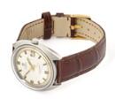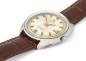 Seamaster Cosmic of steel, ref. 166.026. Mechanical movement with automatic winding and date. 1970s. Leather strap with buckle of gold-plated steel. Diameter 35 mm.