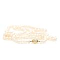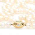Lang perlekæde prydet med talrige kulturperler monteret med diamantlås af 18 kt. guld. Perle diam. 6,9–7,3 mm. L. 93 cm.