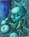 “Nøglens vogter. Lovens vogtere 12.” Signeret Boberg 1967. Farveblyant på papir. Lysmål 9×7 cm.