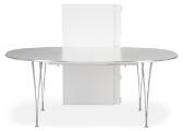 “Superellipse”. Spisebord med udtræk samt to underliggende tillægsplader, klemben af forkromet stål, plade af hvid laminat med alukant. Model B619. Udført og mærket hos Fritz Hansen. H. 72,5. L. 180/300. B. 120. (3)