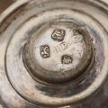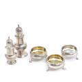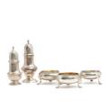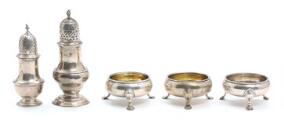 Three almost identical English sterling silver salt cellars. Makers David Mowden, London 1763, D & R Hennell, London (1759–1771) and William Bond & James Phipps I, London (1754-?). And two sterling silver casters. Makers Richard Palmer I, London 1766 and unidentified maker, London, 1945. Total weight app. 285 g. H. 3.5–12.5 cm. (5)