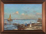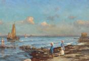 Kystparti fra Aalsgaarde med legende børn. Sign. C. F. Ahl. Aalagaarde 1916. Olie på lærred. 44×64 cm.