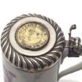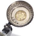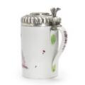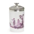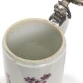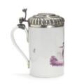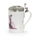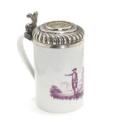 Porcelain tankard decorated in purple with soldiers in landscape. The Danish Royal Porcelain Factory, c. 1780. Mounted with Baroque silver lid, coin inserted, Frederik III, 4 mark / krone 1659 “Eben Ezer”, H 100B, S 36, Aagaard 77.1, the coin is minted in memory of Carl X Gustav's failed attempt to conquer Copenhagen. The dramatic mint mark depicts the hand of God, who with the Sword of Justice cuts off the hand of the Swedish king, who is grasping for the Danish crown. Gadroned edge, leaf-shaped thumb piece. Silvermaker Morten Christensen Kirchhof, Copenhagen 1715. H. 15 cm.