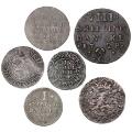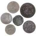 Norge, Frederik III, skilling 1662, NMD 245; Christian V, 2 skilling 1699, NMD 242; Frederik IV, 8 skilling 1728, samtidig forfalskning, NMD 41; frederik V, 2 skilling 1762, NMD 27; skilling 1763, NMD 28; Christian VII, 2 skilling 1803, NMD 90. (6)
