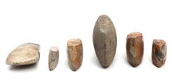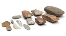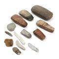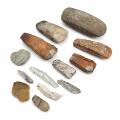 Arbejdsøkse af bjergart samt fem økser og seks flækker af okkerfarvet og grålig flint. Yngre stenalder. L. 6–19. (12)
