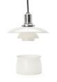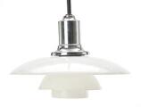 “PH 2/1”. Chromed metal pendant, multi layer opal glass shades and a multi layer opal glass U-4 lower shade. Manufactured by Louis Poulsen. (2)