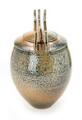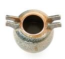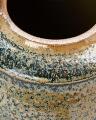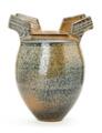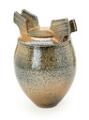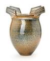 Lågkrukke af stentøj modelleret med “vinger”. Dekoreret med brun saltglasur. Sign. Birck, 85. Unik. H. 26,8. B. 21. Diam. ca. 18.