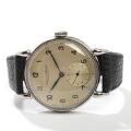 A steel gentleman's wristwatch. Silvered dial with blue hands and small seconds. Manual winding. Case diam. 34 mm. Circa 1940s.
