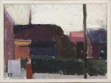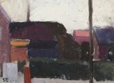 Byparti. Signeret SE. Olie på masonit. 25,5×34 cm.