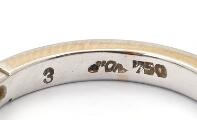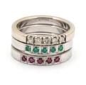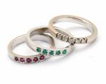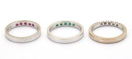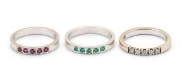 Tre allianceringe af henholdsvis 14 og 18 kt. hvidguld henholdsvis prydet med talrige brillantslebne diamanter, facetslebne rubiner og smaragder. Samlet vægt ca. 10,5 g. B. 2–3 mm. Str. 52.5–54. (3)