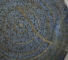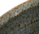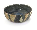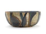 Circular stoneware bowl with incised relief deor. Decorated with blue, brown and grey glaze. Signed monogram. Unique. H. 12 cm. Diam. 30.5 cm.