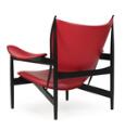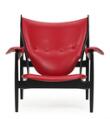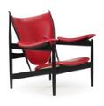“Høvdingestol”. Lænestol af sortlakeret træ, betrukket i sæde, ryg og armlæn med rødt skind. Model FJ 4900. Udført hos Hansen & Sørensen, Ringkøbing.