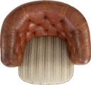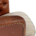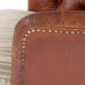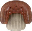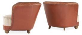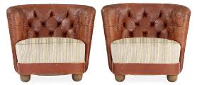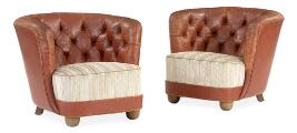 Et par lænestole med ben af bejdset bøg. Sider og ryg med brunt/rødt skind. Sæde betrukket med lyst blomstret stof. (2)