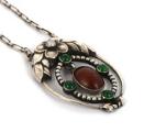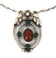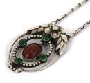 An amber and chrysoprase necklace decorated with a flower and foliage, set with cabochon amber and chrysoprase and mother-of-pearl, mounted in silver. Design no. 8. Weight app. 10 g. Pendant L. 4 cm. Chain L. 46 cm. Georg Jensen 1909–14.