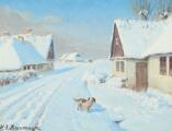 Winterscape with a dog in the middle of the road. Signed H.A. Brendekilde. Oil on canvas. 32×42 cm.