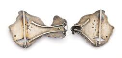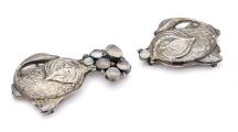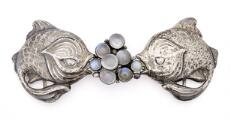 To-delt bæltespænde af sølv i form af to fisk prydet med talrige cabochonslebne månesten. Vægt ca. 51 g. B. 4,9 cm. L. 11,9 cm. (2)