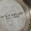 Fremstår med patina, herunder ridser og mærker. Nogle sorte overfladepletter. Skål, borddligher samt kuvertaskebæger med indgraveringer. Ene etui med mindre stødmærke. Størstedelen med ældre prismærker.