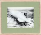 Orignalt s/h pressefotografi af det tyske lufskib LZ 129 Hindenburg forud for afrejsen fra Frankfurt am Main i foråret 1936. Bagside med agenturstempel, restriktionsstempel samt håndskrevet datering, '1936'. Egetræsramme med dobbeltglas. Lysmål 14×18 cm. Rammemål 25×29 cm.