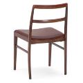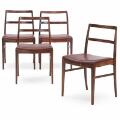 Sæt på fire spisebordsstole af palisander. Sæde betrukket med bordeauxfarvet skind. Model 430. Udført hos Sibast Møbler. (4)