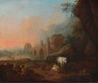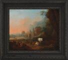 To hyrder med hest og geder hviler i et bjerglandskab. Usigneret. Olie på lærred. 48×57.