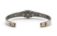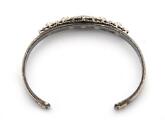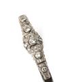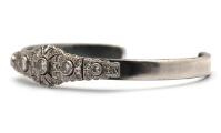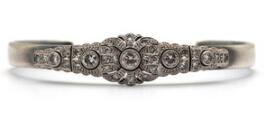 An Art Deco diamond brooch set with numerous brilliant and single-cut diamonds, mounted in platinum redesigned and attached upon a bangle set with two brilliant-cut diamonds weighing a total of app. 0.02 ct., mounted on 18k gold and silver. W. 5.5–12 mm. Weight app. 19.5 g. Diam. int. app. 4.5×6 cm.