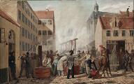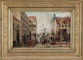 “Ildebrandsscene i Landemærket”. A fire in the street Landemærket in Copenhagen. 1832. Unsigned. Oil on canvas. 24×37 cm.