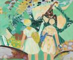 Komposition med to kvinder. Sign. monogram. Olie på lærred. 58×70.
