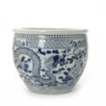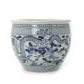 Stor kinesisk scroll holder af porcelæn dekoreret i underglasur blå med drage og krysantemer. 20. årh. Diam. 36 cm. H. 30 cm.