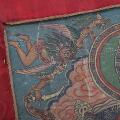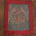 Tibetansk thangka med guru Rinpoche siddende på en lotustrone. Farvepigment på lærred. Signeret på bagsiden. Monteret med stof. Ca. 1900. Billedfelt 26×20 cm.