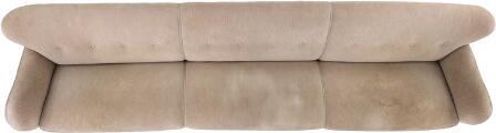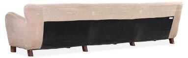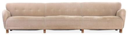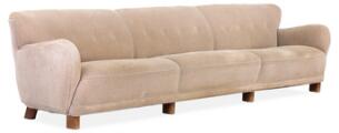Rare four seater sofa with stained beech oval legs. Upholstered with light fabric. Manufactured 1930–1940s by Fritz Hansen. L. 303 cm.