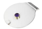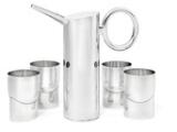 Round sterling silver wine pitcher with oval handle and four sterling silver wine goblets with oval base and round top. The wine pitcher's cover inside with cabochon-cut amethyst surrounded by gold. Marked Ole Bent Petersen, 925S, Sterling, Denmark. Made 1990. Total weight 2118 g. H. 10–26 cm. (5)