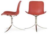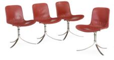 “PK 9”. Set of four chairs with steel frame. Seat and back upholstered with red leather. Designed 1960. Three made and stamped by E. Kold Christensen, one made and marked by Fritz Hansen, 1989. (4)