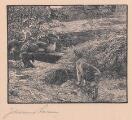 Garden scenery with cat and marten. Signed Johannes Larsen. Woodcut. Visible size. 19×20.5 cm.