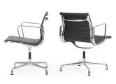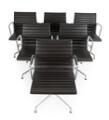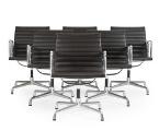 “Aluminium Group”. Set of six armchairs with chromed aluminum swivel frame. Seat and back upholstered with dark brown leather. Model EA 108. Manufactured and marked by Vitra, 2016. (6)