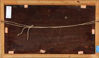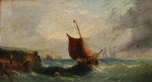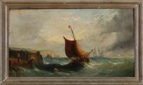 Marine med sejlskibe nær Dovers hvide klipper. Usigneret. Olie på malepap monteret på træ. 26×47.