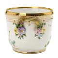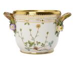 “Flora Danica” porcelain wine cooler decorated in colours and gold with flowers, handles in the shape of twisted twigs and repousse flowers. 3570. Royal Copenhagen. H. 12.5 cm. L. 21 cm.