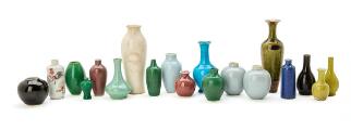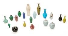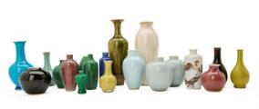 19 diverse kinesiske miniature vaser af porcelæn, dekorerede i monokrome glasurer, clair-de-lune, turkis, grøn mv., heraf en flaskevase mærket Kangxi; dog en enkelt med bemaling i form af haner. 19/20. årh. Enkelte med afslag. H. 6,5–14,5 cm. (19)