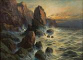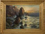 Kystparti med bølger mod en kyst. Sign. Frank Hider. Olie på lærred. 73×99,5 cm.