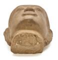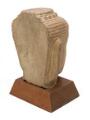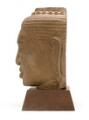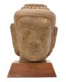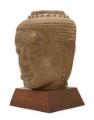 A 20th century Khmer Bayon style sandstone Buddha's head. Wooden base. H. 32/40 cm.