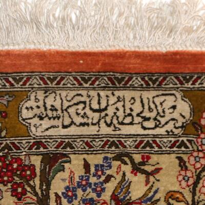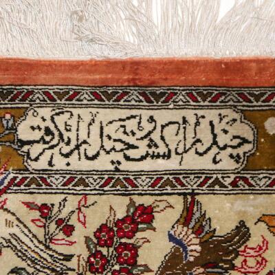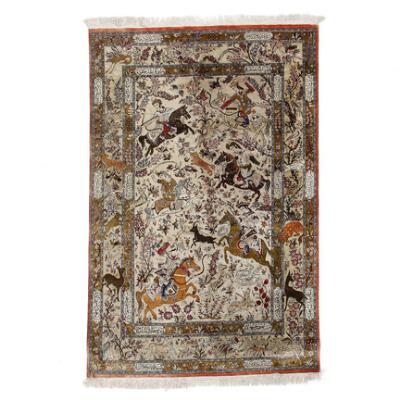 Qum helsilketæppe, Persien. Klassisk jagtsceneri, biborter med persiske digte. Ca. 2000. 200×134.