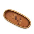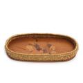 Bakke af frugttræ indlagt med mørkt træ i form af sommerfugle og blomster og kant af bast. Sign. monogram. Unik. H. 3,5. L. 24. B. 11.