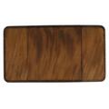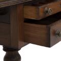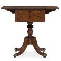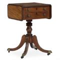Lille engelsk bord af mahogni med kant af nøddetræ, hver side med klapper, front med to skuffer, profileret søjle med firpas fodstykke, sabots og spolehjul af bronze. 19. årh.s begyndelse. H. 73. L. 63. B. 46.