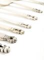 Comprising: 12 bouillon spoons L. 13.3 cm., 11 luncheon knives with long handle L. 20.4 cm., 11 luncheon forks L. 16.6 cm., 11 dessert spoons L. 17.3 cm., 8 pastry forks L. 14.2 cm., 6 fruit knives L. 16.6 cm., 11 coffee spoons L. 11 cm.