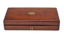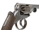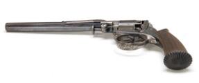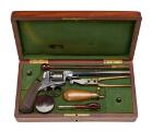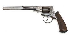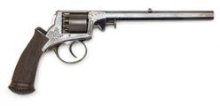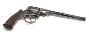 A good long-barreled double action percussion revolver in calibre 32 of Adam's patent made in Belgium around 1855. Cross-filed stock with ebony butt cap, lightly engraved frame marked on the right side with ADAM'S PATENT No 10587 and on the left side ADAM'S PATENT 1851, on the left side also a bullet setter, 5-shot cylinder marked ELG in oval, approx. 17.8 cm. long octagonal barrel rifled with 5 grooves. In the mahogany case lined with green velvet a cleaning stick, bullet mould for two bullets, a copper powder flask, a wooden box for percussion caps and a piston key with a reamer. The sight is somewhat unusually placed approx. in the middle of the barrel.