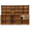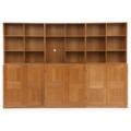 Wallunit of solid oak consisting of three cabinets with matching plinths and three bookcases. One cabinet mounted with three small and six large drawers. Made by Rud. Rasmussen cabinetmakers. Cabinets. H./W. 76 cm. D. 36 cm. Bookcases. H./W. 76 cm. D. 27,5 cm. Plinths. H. 5 cm. (9)