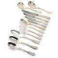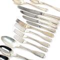 “Old Danish”. Silver cutlery, comprising 13 dinner spoons, 13 dinner forks, 14 dessert spoons, 12 lunch forks, 2 child spoons and 4 serving pieces. Weight app. 3765 gr. And 15+1 dinner knives, 14 lunch knives and 2 fruit knives with silver handles. (90)
