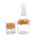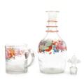 Karaffel og krus af klart glas, dekoreret i emaljefarver med blomster, med presset prop. 19. årh. H. 9 og 23 cm. (2)