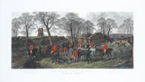 “Fox-Hunting plate 4 - The End of a Good Run”. Inscribed in print engraved by W. Summers, uublished July 23rd 1878 by G Picqueen, London. Handcoloured aquatint. Visible size 75×131 cm.