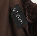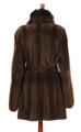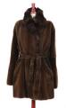 Pelsfrakke af plukket mink og chinchilla med knapper af læder, brunt silkefoer, to lommer og bindebånd. Str. ca. 42. L. midt bag 86. Maks. ærmelængde 68 cm.
