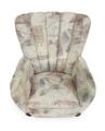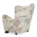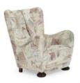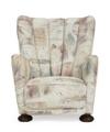 Overpolstret lænestol med ben af bejdset eg og bøg, betrukket med mønstret møbelstof. 1930–40'erne.